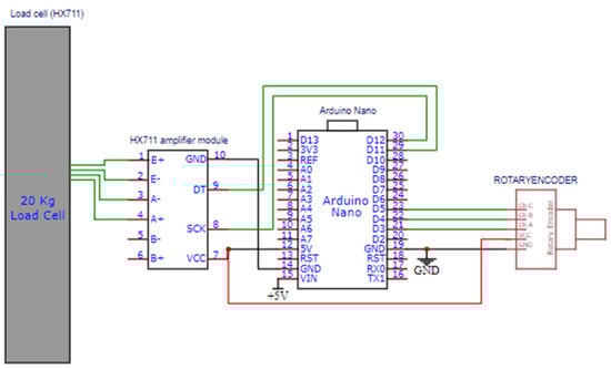 As for the software setup of the force and displacement assessment test, for the force assessment test, an Arduino Nano is used to collect the data extracted from the load cell. As for the displacement assessment test, a myDAQ unit is used to read the data extracted from the encoder. The setup is powered via a power supply, and a MOSFET is used with a high pass filter as the motor driver to pass current to the NiTiNOL springs from the power supply. Figure 6 shows an overview of the electrical schematic diagram for the force and displacement assessment tests.