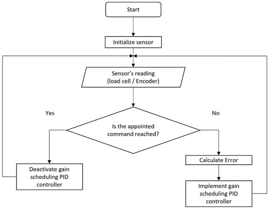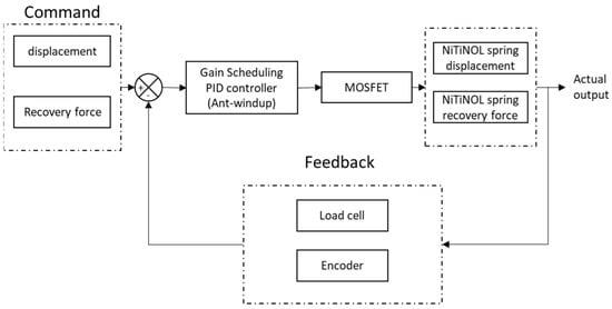 The data gained from the NiTiNOL spring’s assessment tests are analyzed and used as the feedback signal in a gain-scheduling PID controller. In order to determine the gain-scheduling values, where different gains were tested for each value, the different gains were assigned for each value depending on its response. The PID controller is applied to different commands and compares the extracted feedback signal to the commands given in order to manipulate the NiTiNOL spring behavior to follow a desired input, enabling different displacement and force commands for the lifecycle tests. The PID commands used to manipulate the NiTiNOL springs are the step, square wave, sine wave, and staircase commands. These various commands ensure the compatibility of the gains determined for the gain scheduling PID controller. Figure 7 demonstrates the functional block diagram of the system, while Figure 8 represents the flow chart of the control scheme.