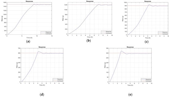 A closed-loop force control of step commands of (a) 1500 g, (b) 1200 g, (c) 900 g, (d) 600 g, and (e) 300 g.