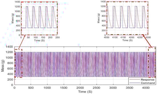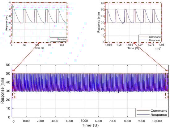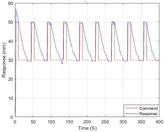 The square wave command is crucial but straightforward since it confirms how the controller follows a differentiating signal. In addition, the square wave command is used to run a lifecycle test, which helped estimate the life expectancy of the NiTiNOL springs. The frequency of the square wave command used is 0.25 Hz, the upper limit of the square wave is 50 mm, and the lower limit is 30 mm, which stands for 70% and 40% of the maximum deformation of the spring under an attached load of 500 g. The number of cycles in this test was 950 cycles; thus, if the actuator is activated once per day, then the actuator is expected to operate for at least 2.6 years based on the highlighted result. Figure 14 shows the controller response with the square wave command, while Figure 15 shows the controller’s response with the square wave command under this lifecycle test.