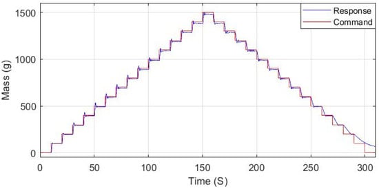 The staircase wave command is more complicated than the square wave command. This command has a rising step every 10 s where the signal was initiated from 0% of the maximum expected force of the NiTiNOL spring; then, the signal starts increasing by 10% for each step until it reaches 100% for the maximum expected force; after that, the signal begins decreasing by 10% for each step until it returns to 0% of the most expected force. This test demonstrated the PID controller’s ability to simulate different linear command values. Figure 11 displays the PID controller response to the staircase wave command using the developed closed-loop force control system. It is noted from the graph that as the command decreases over time, the feedback’s response gradually decelerates. The deceleration can be owed to the drop in temperature difference between the NiTiNOL spring and the ambient temperature, which led to a slower heat dissipation, causing the large deviation shown at the end of the graph.