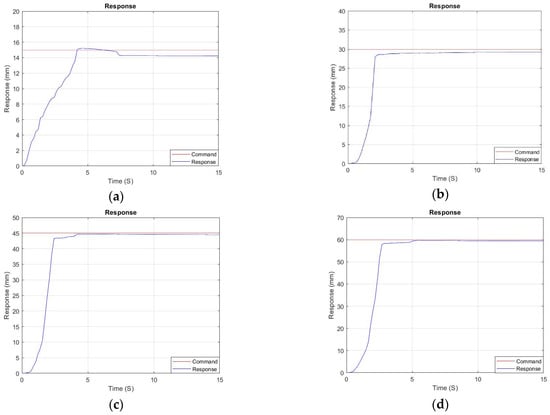A closed-loop displacement control of (a) 15 mm, (b) 30 mm, (c) 45 mm, and (d) 60-step command signal.