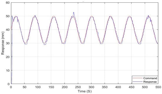 The sinusoidal wave command is an essential command due to the fact that it is commonly used as a measurement criterion for the performance of different controllers. The sinusoidal wave command is used to test the controller for non-linear commands. The sinusoidal wave command used has a frequency of 0.4 Hz, the upper limit of the sinusoidal wave is 50 mm, and the lower limit is 30 mm, which stands for 70% and 40% of the maximum deformation of the wire under an attached load of 500 g. Figure 16 shows the controller response with the sinusoidal wave command.