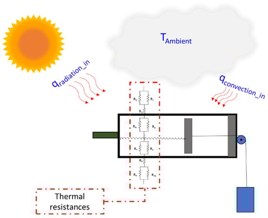 A simplified one-dimensional (1D) model has been built under the steady-state condition for the SHC in order to understand the thermal behavior of the SMA thermomechanical actuator. The analytical-based model gives a clear indication of the factors that affect the SHC in terms of heat transfer aspect. The 1D model has been created based on taking a cross-section from the SHC and based on the natural heat fluxes and thermal resistance, as Figure 17 demonstrates.