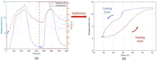 Patra et al. [23] carried out a study to investigate the elasticity behavior of NiTiNOL wires under different stresses to evaluate the variation in strain and hysteresis. The result of the carried experiment showed that the SMA wire understudy entered a hysteresis loop due to the fact that although the applied stress surpassed the loading curve, the SMA managed to regain its predefined shape. Additionally, the study showed that the loading and unloading behaviors of the SMA wire were divergent, in which the author owed this to an accumulation in the strain energy.