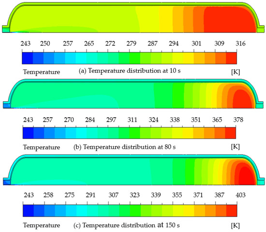 - Axial thermal stratification during the fast-filling process was observed in the 145 L type III hydrogen tank, with a ratio of length to diameter of 4.72, and the region of the highest temperature was located at the opposite end of the injector.
