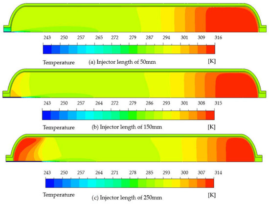 - The effect of injector length on the temperature distribution and evolution during the fast-filling process was examined. The result showed increasing the length of the injector contributed to decreasing both the maximal temperature and mass averaged temperature during the fast-filling process.