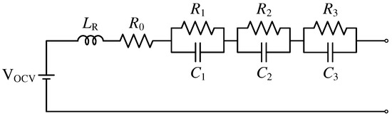 A dynamic battery model with three -elements, as depicted in Figure 1, can be used to represent a battery’s dynamic behavior, as described in [21,46]. A series inductor , a series resistor , and three -elements, to , make up the ECM. The voltage source indicates the open-circuit voltage after a sufficient battery relaxation time. All metrics are dependent on the battery’s state of charge (SOC) and temperature [47].