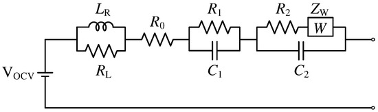 A special constant phase element called Warburg impedance, as described in [49], can be used to replace one of the previously specified -elements to better represent the battery cell’s low-frequency behavior. In addition, the series inductance can be supplemented with an extra parallel resistance to represent the inductive high-frequency behavior. As a result, the battery cell model shown in Figure 2 is generated, which is referred to in this study as the Warburg impedance model or Warburg model.