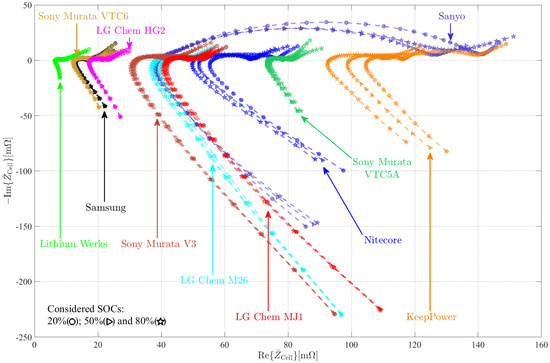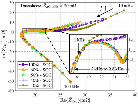 The elements of x should be given suitable initial values. The selected optimization-solver typically changes the estimated parameters x over several iterations to minimize the sum of the root of the squared differences between the estimated and the measured impedance values for the frequency range to . The battery impedance variation related to the SOC becomes nearly neglectable around medium SOCs, as can be seen in Figure 4. As a result, the impedance of battery cells is measured at a characteristic SOC of 50%.