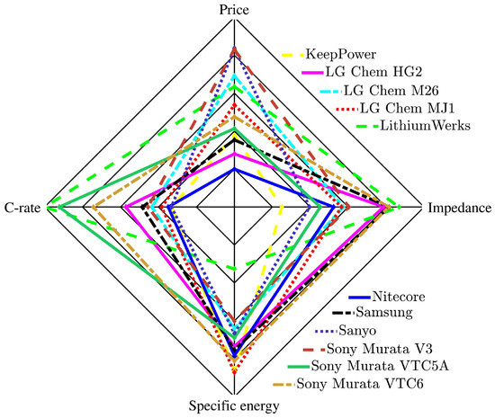 The battery cells listed in Table 1 are considered within the scope of this paper’s battery cell comparisons. Individual battery cells will now be referred to by their manufacturer name and model type description to identify them. Except for the Lithium Werks ANR26650M1B, which is a high-power cell with a 26650 geometry and a lithium–iron–phosphate chemistry (), all of the listed cells have a cylindrical 18650 geometry and NMC-based chemistry. The primary characteristic parameters included in Table 1 are mostly taken from the datasheets of the cells or may be found in [54]. Aside from [54], ref. [55] provides a full overview of battery cell characteristics and additional test results.