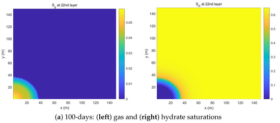 Figure 9 depicts gas (S) and hydrate (S) saturations in the converted 3D coordinate system (see Figure 2) within the 22nd layer (i.e., the first hydrate zone layer or SS in Figure 4) at the depth of 140.1 m, whereas Figure 10 is for the same at the 29th layer (i.e., the first mud zone layer or mud in Figure 4) at the depth of 141.5 m. In each figure, (a) after 100 days and (b) after 154 days are presented. In the mud, saturations of gas and hydrate are close to zero, whereas in the SS, we assume that hydrates are dissociated into the gas phase. We note that the overall saturation pattern between gas and hydrate are similar through the dissociations, which can deteriorate the sensitivity in calculation of the electrical resistivity field (see Section 4.3).