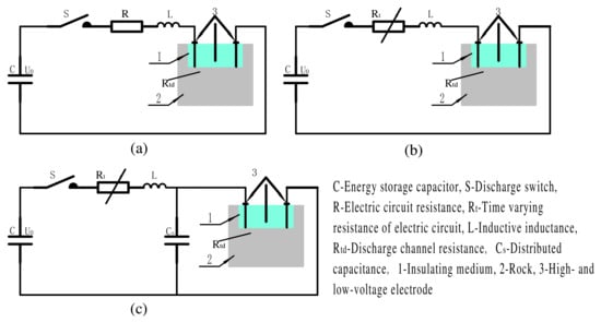 According to the characteristics of discharge circuit in EPB process, the prediction model of discharge circuits in high-voltage EPB rock-breaking based on constant resistance (RLC model for short), the prediction model of discharge circuit in high-voltage EPB rock-breaking based on time-varying resistance (TV-RLC model for short), and the prediction model of discharge circuit in high-voltage EPB rock-breaking based on time-varying resistance and distributed capacitance (TV-CRLC model for short) were built. The equivalent circuits of these three models are shown in Figure 1.