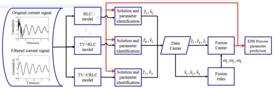 To improve the prediction accuracy of high-voltage pulse discharge circuit parameters, a fusion method for the multi prediction model was proposed. As shown in Figure 2, the multi-model fusion framework of discharge circuits for high-voltage EPB rock-breaking is presented. After filtering and identifying the parameters of high-voltage EPB process, parameter identification array is obtained. Symbol j is the number of the parameters to be identified. The values are 5, 6, and 7 for the RLC model, TV-RLC model, and TV-CRLC model, respectively. Then, according to the predicted current as the basis of fusion, the parameters of the high voltage pulse discharge process can be predicted by weighing the fusion module.
