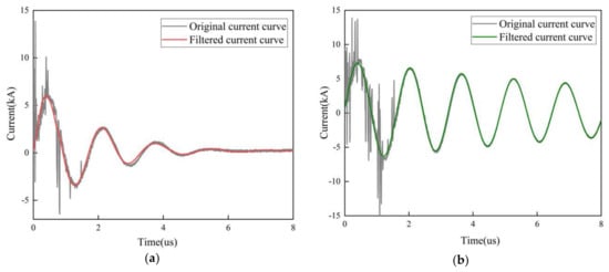 It has a great interference on the collected current signal. The current signals in different rock samples are collected by the electrical parameter detection subsystem. Consequently, it is essential to use a software algorithm to filter the current signals in order to extract and analyze the current signals of different rock samples. Under the intense interference of the pulse power supply, the filtering performance of traditional filtering algorithms [,] is restricted. Singular value decomposition (SVD) filtering algorithm has an excellent filtering effect [,]. Before SVD filtering denoising, it is necessary to construct the matrix of the original current signal collected by the electrical parameter detection subsystem, including the Toeplitz matrix and Hankel matrix [,]. Toeplitz matrix can helps speed up the filtering process. A SVD filtering algorithm based on the Toeplitz matrix is proposed. The original and filtered signals are shown in Figure 4.