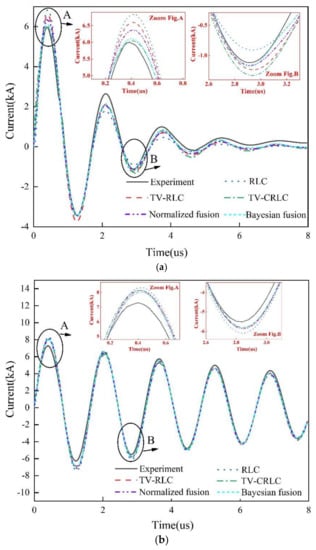 The identified parameters are substituted into each model. As shown in Figure 5, the current prediction curve of different circuit models and the test curves of high-voltage EPB were compared. The overall prediction accuracy of the TV-CRLC model is the highest, followed by the TV-RLC model, and then the RLC model. This means that the weight of the TV-CRLC model is higher when Bayesian fusion is adopted. Different models have different prediction accuracy distribution in different time intervals. The difference of models directly affects the prediction accuracy, so the model fusion is required to improve the parameter prediction accuracy in the high-voltage EPB rock-breaking process.