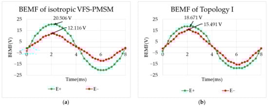 where is the back EMF at flux enhancing and is that at flux weakening. Note that the air gap flux density is considered proportional to the back EMF at the same speed (assuming no saturation), and thus the back EMFs at flux enhancing and weakening represent the maximum and minimum air gap flux densities, respectively. The larger the back EMF difference is, the better the flux regulation ability is. Figure 4 shows the simulated back EMF of the isotropic VFS-PMSM, Topologies I and II at flux enhancing and weakening, and of the three cases can be obtained and expressed by , and , respectively. As shown in Figure 4, is the largest, and is the smallest.