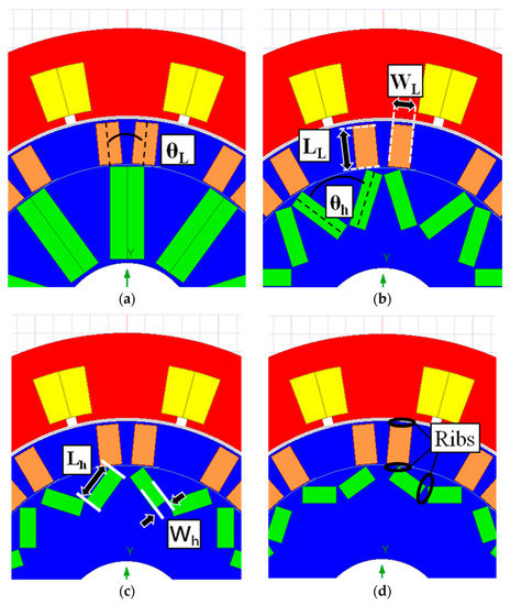 In addition, the minimum width of the ribs is 0.5 mm, as shown in Figure 8d, by considering the manufacturing capability, and thus the thickness Wh and length Lh of the HCF magnet will be limited and vary with θL due to the limited rotor space, rib sizes and the position constraint given in Figure 11. The simulated maximum torque at different θh varying with θL is shown in Figure 12, where under the limited magnet size, the torque of the V-type and flat-type increases as θL decreases while that of the spoke-type hardly changes. The reason is that Lh of the V-type and flat-type increases as θL decreases. Although this also decreases Wh, the HCF magnet length Lh appears to have a greater impact on torque production, and torque increases as θL decreases. On the other hand, no matter how θL changes, it has only a very minor effect on Lh for the spoke-type rotor, but Wh is greatly reduced. Therefore, the effect of the two changes (i.e., Lh and Wh) cancels each other out. Meanwhile, it can be seen from Figure 12 that even if the amount of HCF magnets for the V-type and flat-type are increased to the maximum usage limited by the ribs size between two pieces of HCF magnets, the maximum torque is still lower than that of the spoke-type rotor, whose amount of HCF magnets are the largest for the space constraint.