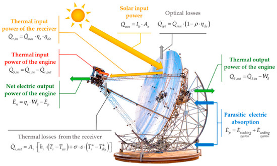 Figure 1. Scheme of the energy balance of the dish-Stirling concentrator [15].