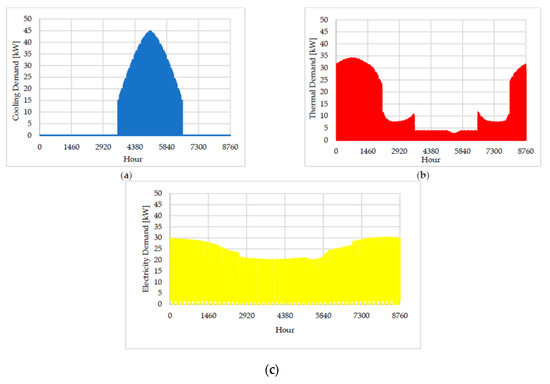 Figure 2. Hourly profiles of the case study: (a) cooling, (b) thermal, and (c) electricity demands [15].
