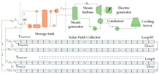 Ampuño et al. [21] presented the modeling of a solar thermal energy generation plant consisted a field of solar collectors, a storage tank, and an energy conversion system. In particular, the solar collector field is based on the parabolic trough collectors technology, storage tank, steam generation, steam turbine, and electrical generator. The thermal energy accumulated in the storage tank is used by a steam generator which produces a steam pressure driving a turbine. The layout of the investigated system is displayed in Figure 4. The total mirror area of the solar field is 2635 m2, whereas the power capacity of the turbine is equal to 0.5 MW.