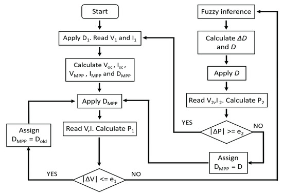 The proposed algorithm is known as IOCV&FL in this paper, and combines two different techniques—the fractional open-circuit voltage and fuzzy logic. The main advantage is the possibility of measurement and calculation of the open-circuit voltage indirectly without the need to disconnect the circuit from the power supply, eliminating the switch used for this. The algorithm finds the relationship between the voltage at the maximum power point and the optimal duty cycle to apply this in the converter. Using an initial duty cycle, the algorithm calculates the optimal duty cycle and if this duty cycle does not extract the maximum power, a second stage starts to find it. This stage uses fuzzy logic and reads the input voltage and input current to recalculate the optimal duty cycle. The flow chart of the proposed maximum power point-tracking algorithm is shown in Figure 1.