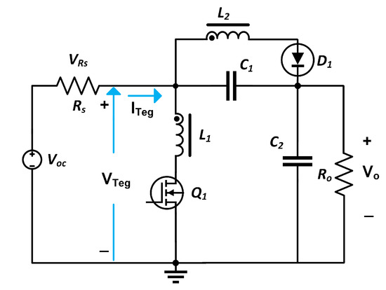 The main advantage of this technique is the option to calculate the voltage at the maximum power point () indirectly without the need to disconnect the power supply from the circuit to sense the open-circuit voltage at any given time, decreasing the components that are needed (eliminating the connection and disconnection MOSFET of the source with the circuit and disabling the control signal of the micro-controller and the power devices that are used for the control of MOSFET), thus reducing power losses in said components. Figure 2 shows the converter used in this paper. is the input current and is the input voltage provided by the Teg.