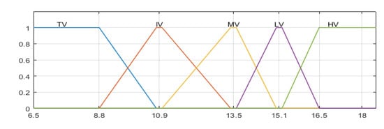 In the case of voltage, its membership functions have the following linguistic labels: TV = Tiny Voltage, IV = Ideal Voltage, MV = Medium Voltage, LV = Large Voltage and HV = Huge voltage. These membership functions are shown in Figure 5. The voltage range for the input is 6.5 V to 19 V, and the membership range of each membership role is 0 to 1.