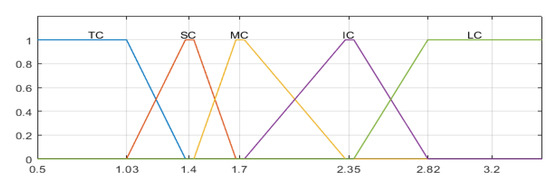 In the case of the current, its membership functions have the following linguistic labels: TC = Tiny Current, SC = Small Current, MC = Medium Current, IC = Ideal Current and LC = Large Current. These membership functions are shown in Figure 6. The current range for the input is 0.5 A to 3.5 A, and the membership range of each membership function is 0 to 1. The range of the five membership functions were obtained heuristically to maximize the power, obtaining an optimal operation of the circuit.