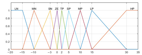 The output of the system is the change in duty cycle. There are nine membership functions and its range was determined heuristically to calculate the near-optimal duty cycle as fast as possible, always looking to obtain maximum power. Its membership functions have the following linguistic labels: LN = Large Negative, MN = Medium Negative, SN = Small Negative, ZE = Zero, TP = Tiny Positive, SP = Small Positive, MP = Medium Positive, LP = Large Positive and HP = Huge Positive. These membership functions are shown in Figure 7. The range of change in the duty cycle is −20% to +35%. The defuzzification method used to calculate the change in the duty cycle was the center of the area (COA) of Mamdani.
