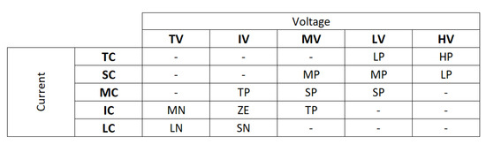 In Figure 8, the fuzzy rule base of the designed algorithm is observed. Due to the nature of the system, there are combinations between voltage and current that do not occur during the operation of the circuit since these values are inversely proportional, i.e., the higher the voltage, the less current flow the circuit will have, and vice versa. For example, there will not be a case in which there is TV and TC, which is why in the rule base there is no such condition, and some others.