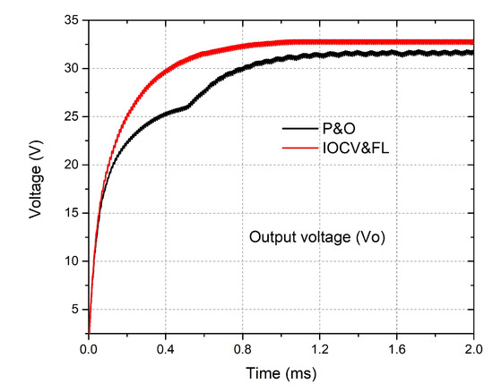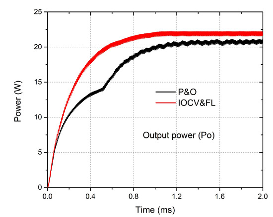 To verify the effectiveness of the proposed MPPT algorithm, the simulation results substantiate that the tracking time of IOCV&FL method is only two sampling periods and is independent of the changes in temperature and load conditions. We compare it with the P&O technique in different scenarios (three cases) and the results obtained indicate that the designed algorithm provides between 3.9% and 5.6% more power to the load than the P&O technique in a 20 W system. Furthermore, the power obtained in transient state is greater. The processing time of the proposed algorithm is lower, and it reaches the near-optimal duty cycle faster than using the P&O algorithm.