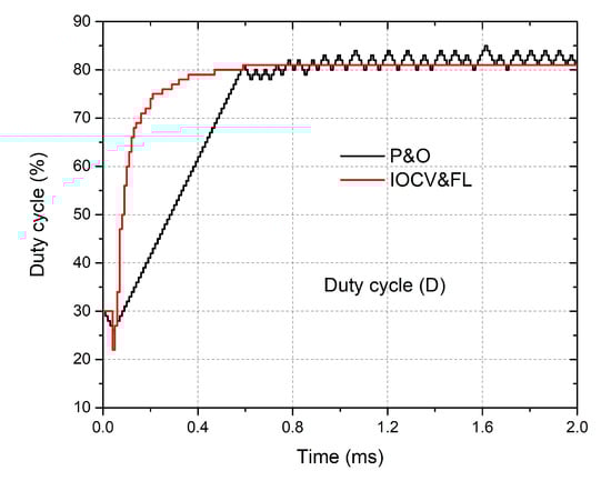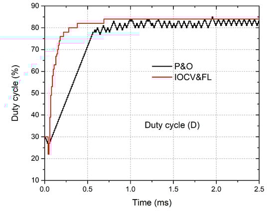 The power obtained by the proposed algorithm in the transitory state is larger than that using the P&O algorithm and, in steady state, the power is 5.77% larger than the power obtained using P&O algorithm. The duty cycle obtained using the proposed algorithm is 81% and using P&O is from 81% to 84% (see Figure 12).