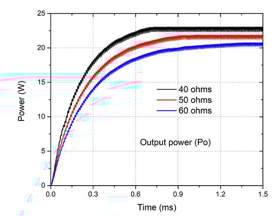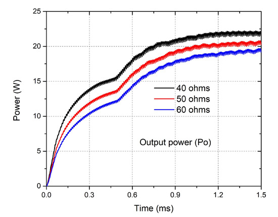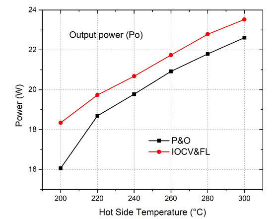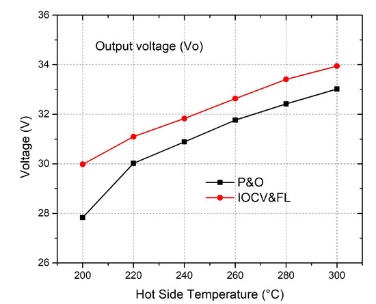 With a hot-side temperature of 200 C, the open-circuit voltage () is 19.8 V. When the temperature is 220 C, the is 20.3 V. With a temperature of 240 C, the is 20.8 V. When the temperature is 260 C, the is 21.3 V. With a temperature of 280 C, the is 21.8 V, and when the temperature is 300 C, the is 22.3 V. These values are the input of the DC–DC converter, and the values of the output voltage obtained with these hot-side temperatures are shown in Figure 13.