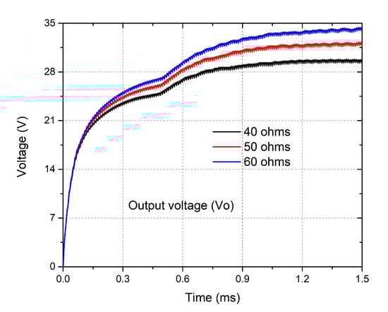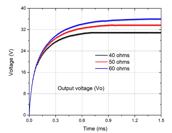 Figure 19 shows the output voltage obtained from different values of the load (40, 50 y 60 ) when the proposed algorithm is used. The average output voltage obtained using 40 is 30.88 V, 33.69 V using 50 and 36 V using 60 .