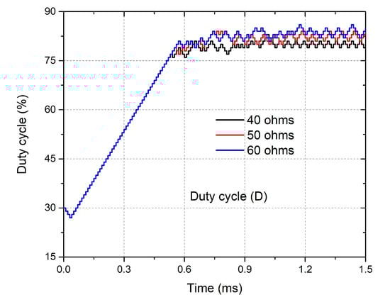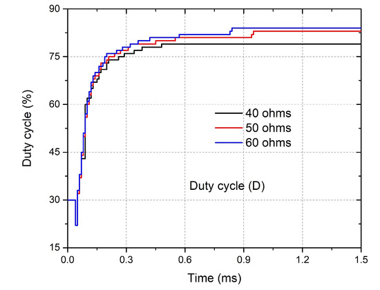 The output power obtained using the proposed algorithm is shown in Figure 20. The average output power obtained for a load of 40 is 22.79 W, 21.65 W for 50 and 20.57 W for 60 . The duty cycle obtained for these different values of the load is shown in Figure 21, the final duty cycle is 79% for a load of 40 , 83% for a load of 50 and 84% for a load of 60 . With the values obtained from the simulation, it can be determined that the power obtained using the proposed algorithm is 4% larger than using P&O algorithm when the load is 40 , 5.5% larger for a load of 50 and 6% larger for a load of 60 .
