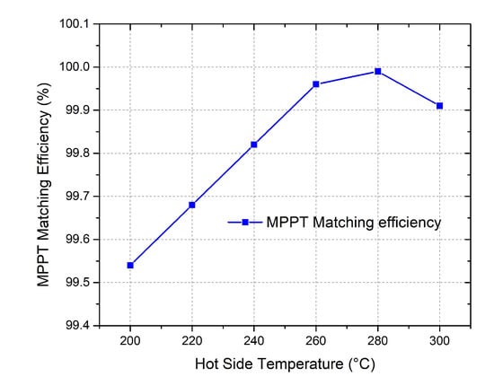 MPPT matching efficiency at different hot-side temperatures for the proposed algorithm.