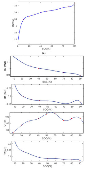 Figure 6a shows the curves of OCV and SOC obtained using the standard OCV test method. Figure 6b shows the measured values and fitting curves of the equivalent circuit parameters of the battery.