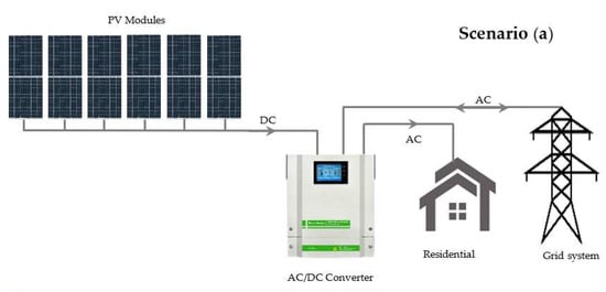In this study, we evaluate the advantages of adding a number of storage batteries to residential grid-connected applications in Baghdad, Iraq (latitude 33.3152° N, longitude 44.3661° E), where photovoltaic systems will be installed on their roofs. The design of the system is shown in Figure 1, reflecting the two distinct scenarios explored: