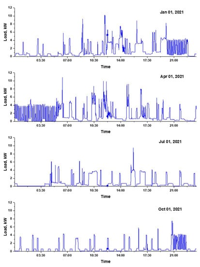 To present generalized results for the selected residential communities, a comprehensive measurement campaign was carried out in three residences over a one-year period (2021) at a 1-min temporal resolution, resulting in the collection of actual load profiles with 1.29 kWh, 16.1 kw peak, 30.8 kWh/day, and 11,237 kWh/year. Figure 2 shows the daily load profiles for four selected days during the year 2021.