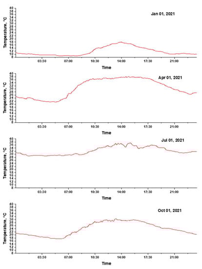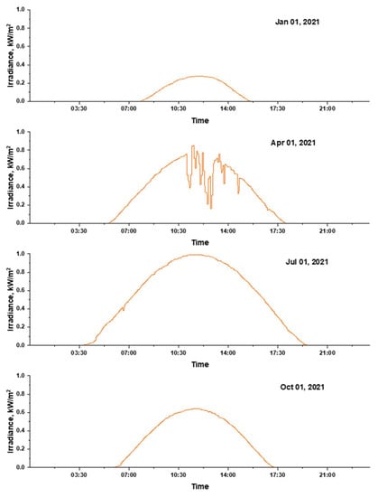 The solar irradiance and ambient temperature data were measured using a weather station model f0300 located at the same selected site at a 1-min temporal resolution for the year 2021. The average daily ambient temperature was 23.8 °C, and the daily solar irradiance on the horizontal surface was found to be 4.6 kWh/m2/d. Figure 3 and Figure 4 show the daily measurements of solar irradiance and ambient temperature, respectively, for four selected seasonal days.