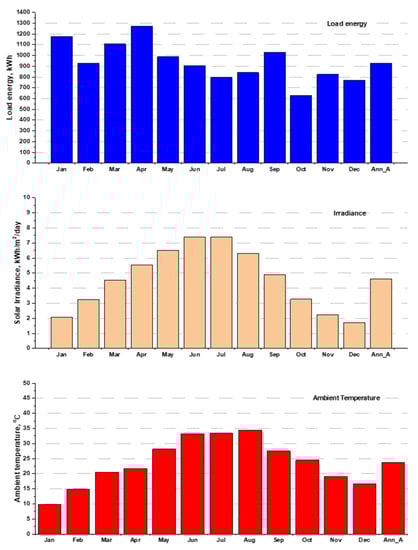 Figure 5 shows the monthly and yearly averages for energy consumption, solar irradiance, and ambient temperature. The average monthly energy consumption was 925.47 kWh, which fluctuated from month to month, and the total annual energy consumption for the year 2021 was 11,237 kWh. The daily average solar irradiance was recorded at 4.6 kWh/m2/day, the highest in current solar irradiance due to the summer months (May–October) and the lowest during winter months (November–February). Spring and fall seasons have higher solar irradiance than winter. The annual average of the ambient temperature is 23.71 °C, which is high during summer and low during winter.