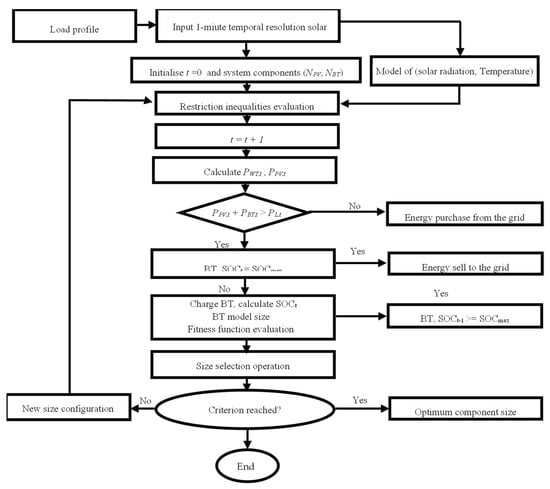 Hassan [,] presented a computational technique for optimizing a photovoltaic with battery storage and a hydrogen fuel cell energy system using experimental data for electrical load and weather data with a 1-min time step. The results clearly show that using an average daily energy of 6.9 kWh, the optimal fuel cell capacity is approx. 2.3 kW, ESB 1.7 kW in a 1.9 kW PV power system. Due to the integration of the photovoltaic system with ESB and fuel cells (FCs), the annual renewable energy component increased from 32 percent to 96 percent. Furthermore, the energy supply, which is the most cost-effective part of the optimal system, levelled the power costs by approximately $0.12/kWh. Lokar and Virti [] investigate the feasibility of using hydrogen for total energy self-sufficiency in residential structures with solar photovoltaic and BT. The research work examines the production of energy in a pilot building in Slovenia, which is a normal residential house with a photovoltaic system and a BT system. Every 15 min, the power system collects data from smart meters. Because solar radiation is substantially lower in winter than in the summer, and snow may cover solar panels and prevent energy generation, solar photovoltaic systems could be supplemented with BT and hydrogen fuel cells to attain total self-sufficiency. The self-sufficiency share of the hybrid PV/BT/FC system would be 63%, which means that the prototype system cannot provide 100% self-sufficiency. However, a more efficient system could be built. A hybrid system that includes a solar system, a battery storage system, and hydrogen fuel cells may provide total self-sufficiency. Fioriti et al. [] determined the size of battery systems for households using a multiyear dynamic and an innovative rain flow-based storage degradation model. The study proposes a multiyear optimization methodology for domestic applications in which the entire lifetime of battery systems is modelled at a 15-min time step using an improved nonlinear degradation model. In this work, the aging of the PV module is also taken into account. An examination of the economic and commercial sizes suitable for 400 selected load profiles in Italy is provided. According to the conclusions, the break-even price of storage is about 400 €/kWh, which is lower than the estimated commercial price. Household photovoltaic capacity is typically used for utilities but is less so because more batteries are required to reduce the monthly bill. Say et al. [] studied the effects of residential photovoltaics and BT on energy production. The study used two open-source and two techno-economic models for situations in Western Australia. The study concluded that to avoid overinvestment, power system planners and investors in long-lived utility-scale renewable production and storage assets must carefully examine the expanding usage of prosumage. Li et al. [] studied the performance of a grid-connected PV/BT household system with the purpose of increasing self-consumption. The study simulated the performance of the techno-economic criteria of a grid-connected residential PV/BT system. The results show that self-consumption ratios vary significantly between months, that they can be increased by subsequently increasing battery capacity, and that their rate of increase varies significantly between months, as well as being highly dependent on characteristics of the customer load and PV energy profiles. Optimal management solutions for domestic storage dispatch have the ability to reduce grid peak demand. Cumulative generation of a residential PV/BT system represents 2.0% of the total grid load. The study shows that the proposed grid-supporting PV/BT systems can contribute to a 1.1% decrease in peak grid demand. In short, a great deal of previous research has investigated how to obtain an optimal BT system that is integrated with parts of renewable energy [,,,,].