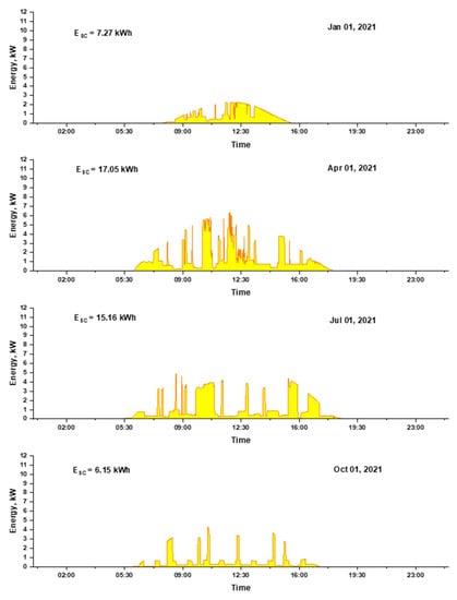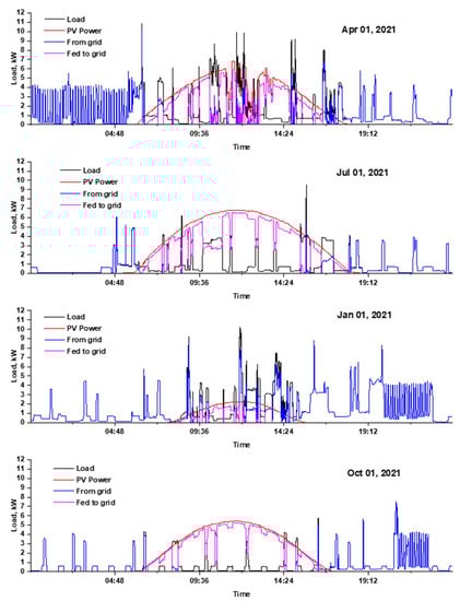 Figure 8 shows the daily energy self-consumption for the selected days using only the PV array: 1 January is 7.27 kWh, 1 April is 17.05 kWh, 1 July is 15.16 kWh, and 1 October is 6.15 kWh. The high energy generated by the photovoltaic array leads to high energy self-consumption considering the electrical load energy. This investigation demonstrates the profitability of combining a battery energy system with a photovoltaic system to increase the self-sustainability by a high percentage.