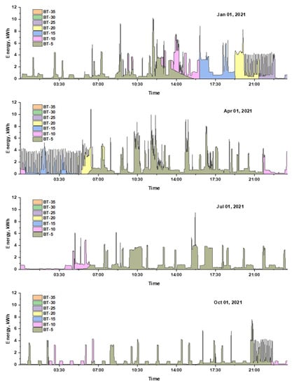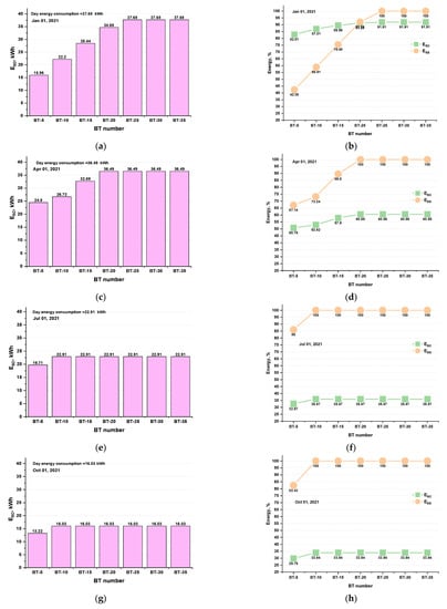 Figure 10 shows the energy self-consumption and energy self-sustainability for various battery bank capacities that are combined with a photovoltaic array for four seasonal days. On 1 January 2021, the optimum bank capacity that could match the highest self-consumption at 100% was BT-25, and the observed energy self-consumption was 37.68 kWh. For 1 April 2021, it was determined that the optimal battery bank capacity that could meet the maximum self-consumption at 100% was BT-20, with a self-consumption of 36.49 kWh. For 1 July 2021, it was calculated that the optimal battery bank capacity that could meet the maximum self-consumption at 100% was BT-10, with a self-consumption of 22.91 kWh. For 1 October 2021, it was found that the optimal battery bank capacity capable of meeting 100% self-consumption was BT-10, with a self-consumption of 16.03 kWh.