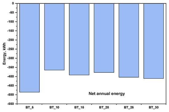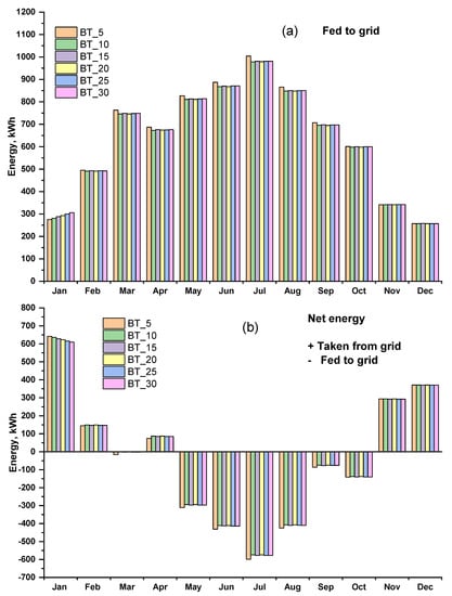 Figure 11 shows the monthly energy distribution at several battery capacities. Figure 11a presents the monthly energy fed to the grid generated by the photovoltaic array at various battery capacities. It can be inferred from this figure that more energy can be fed to the grid during the summer months than during the winter months. The net energy for each month is shown in Figure 11b. The positive value is the amount of energy that needs to be taken from the grid, while the negative value is the amount of energy fed to the grid, which is the amount of energy that exceeds the amount of energy that is needed to charge the battery and supply the load.