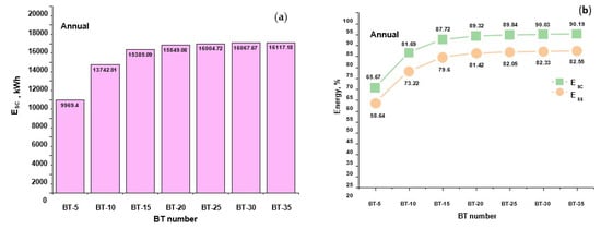 Determining the battery bank capacity that can provide the optimal self-sustainability for daily energy distribution is very difficult; however, this task is essential from a microgrid system point of view. Figure 12 shows the annual self-consumption of energy, with the highest energy value reaching 16,117.18 kWh at a rate of 90.19% at BT-35.