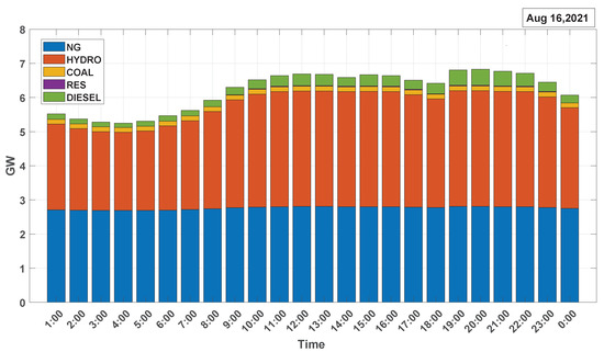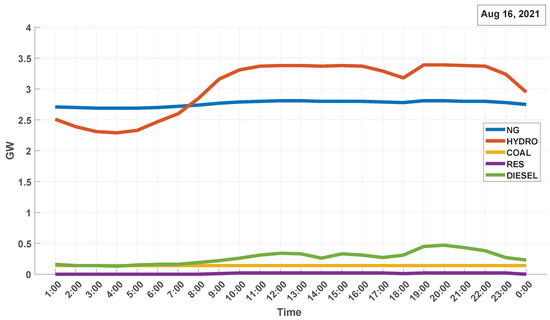 | Characteristic constants of gas and diesel thermal generator, in the quadratic equation of the cost of energy production delivered by each bus generator, as a function of the generator power in units [$/MW2], [$/MW] y [$], respectively. | |