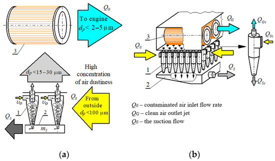 Two-stage (multicyclone, filter bed) filtration system for the inlet air of an off-road vehicle engine: (a) essence of the two-stage filtration system; (b) functional diagram of the two-stage filter, 1—multicyclone (first filtration stage), 2—dust settler and 3—paper filter bed (second filtration stage).