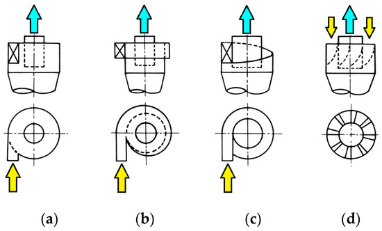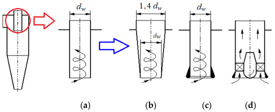Methods of gas supply to the cylindrical part of a return cyclone with inlet: (a–c) tangential, (d) axial. Figure made by the author based on data from the work [34].